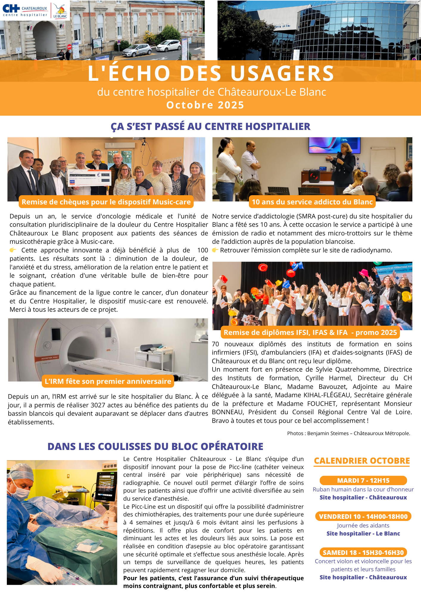 Dans cette nouvelle édition, plongez au cœur de la vie de l’établissement : remise de chèque pour music-care en collaboration avec la ligue contre le cancer, les 10 ans du SMRA du Blanc. Plongez vous dans les coulisses du bloc opératoire.